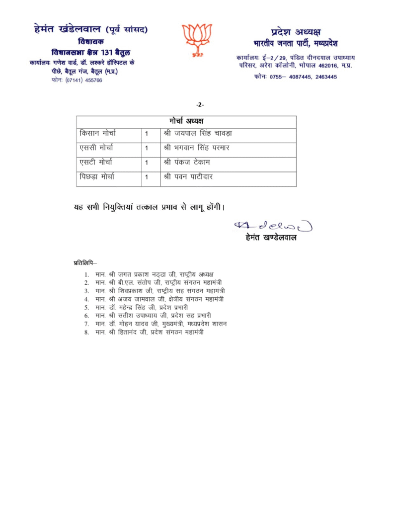 प्रदेश अध्यक्ष हेमंत खंडेलवाल ने सोशल मीडिया पर नवनियुक्त पदाधिकारियों को शुभकामनाएं देते हुए कहा कि,