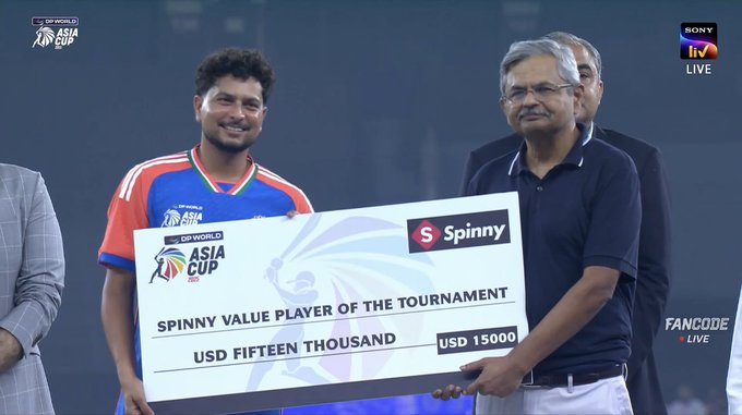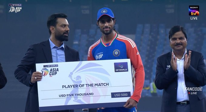 मैच जीतने के बाद जब भारतीय टीम को ट्रॉफी लेने बुलाया गया, तब खिलाड़ियों ने PCB चीफ और एशियन क्रिकेट काउंसिल के चेयरमैन मोहसिन नकवी से ट्रॉफी लेने से इनकार कर दिया। भारतीय खिलाड़ियों ने बगैर ट्रॉफी के ही मैदान पर सेलिब्रेशन शुरू किया।