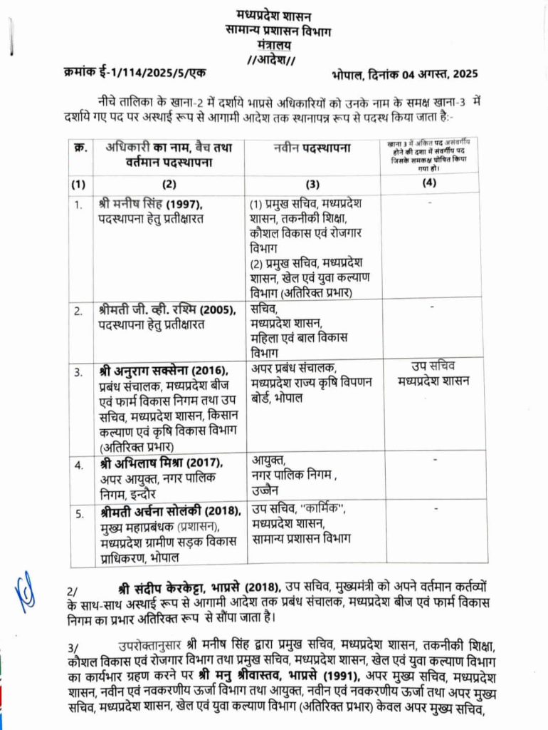 आईएएस मनीष सिंह (बैच 1997), जो अब तक पदस्थापना की प्रतीक्षा में थे, उन्हें अब प्रमुख सचिव, तकनीकी शिक्षा, कौशल विकास एवं रोजगार विभाग का दायित्व सौंपा गया है। इसके साथ ही उन्हें खेल एवं युवा कल्याण विभाग का अतिरिक्त प्रभार भी दिया गया है। यह दायित्व पूर्व में विवेक कुमार पोरवाल (बैच 2000) के पास था, जिन्हें अब इस प्रभार से मुक्त कर दिया गया है। साथ ही मनु श्रीवास्तव (बैच 1991) को भी उक्त विभागों की जिम्मेदारियों से मुक्त कर दिया गया है।