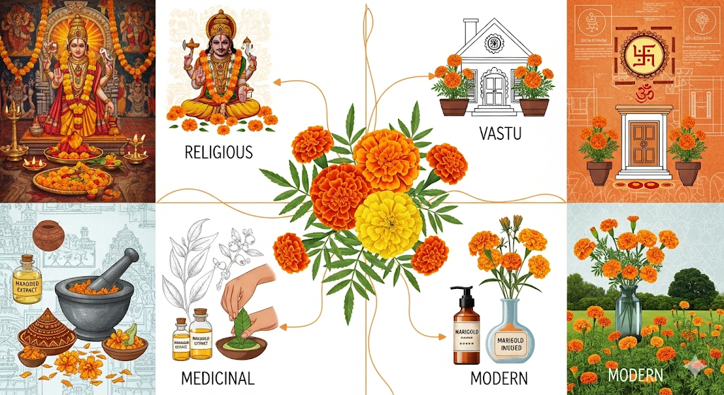 गेंदे के फूल का महत्व: धार्मिक मान्यता, वास्तु, औषधीय गुण और आधुनिक उपयोग