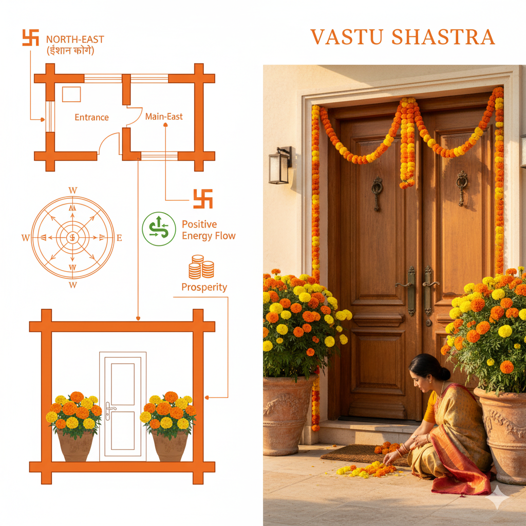 - मुख्य द्वार : दरवाजे पर गेंदे का पौधा लगाने से नकारात्मक ऊर्जा प्रवेश नहीं करती।