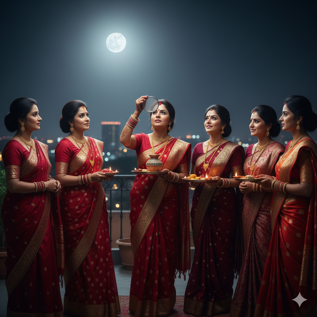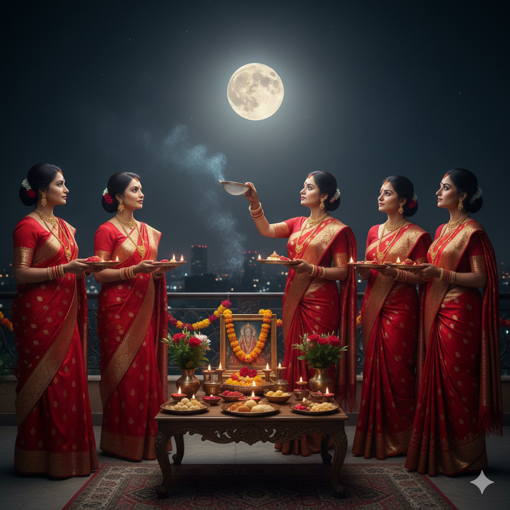 - चंद्र दर्शन – रात में चंद्रमा के उदय पर छलनी से चंद्रमा का दर्शन करें और जल अर्पित करें।
