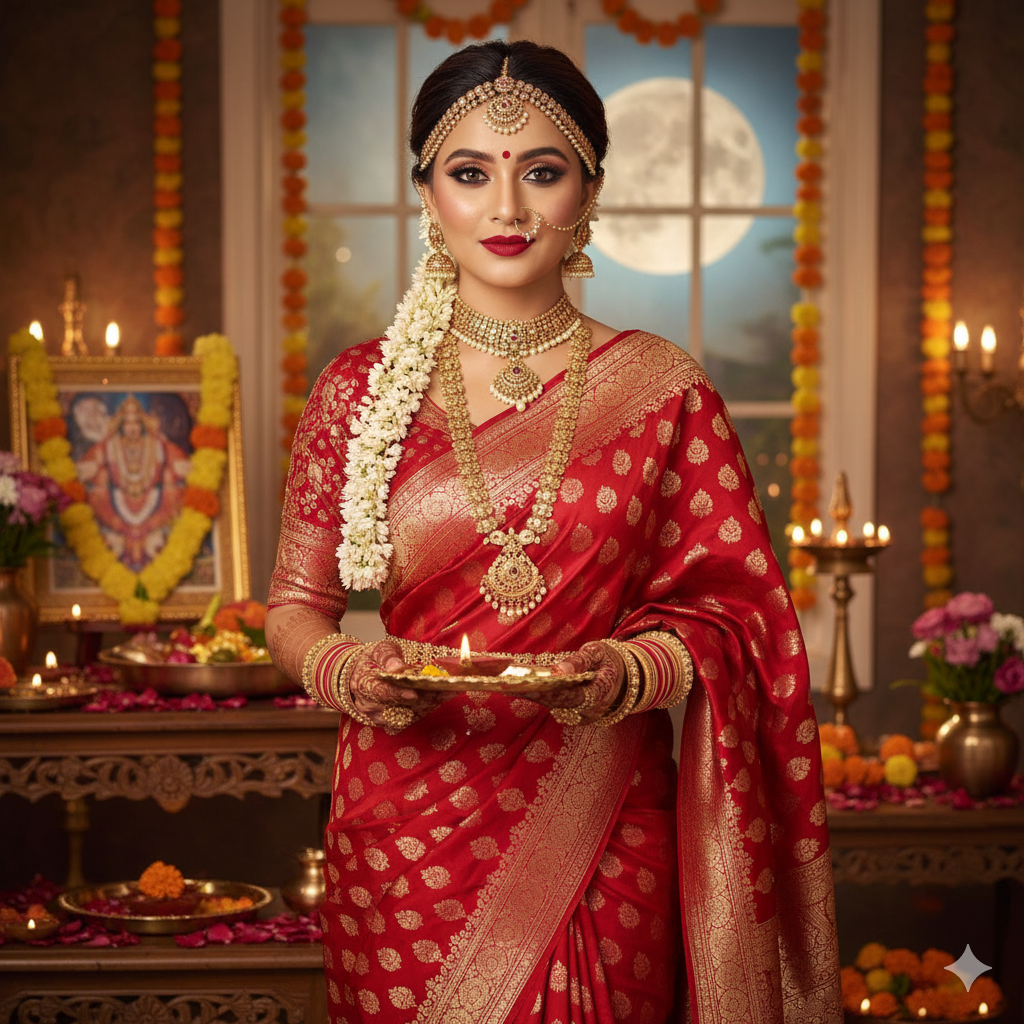 - स्नान और श्रृंगार – महिलाएं सूर्योदय से पहले स्नान करें, नए वस्त्र पहनें और पारंपरिक श्रृंगार करें।