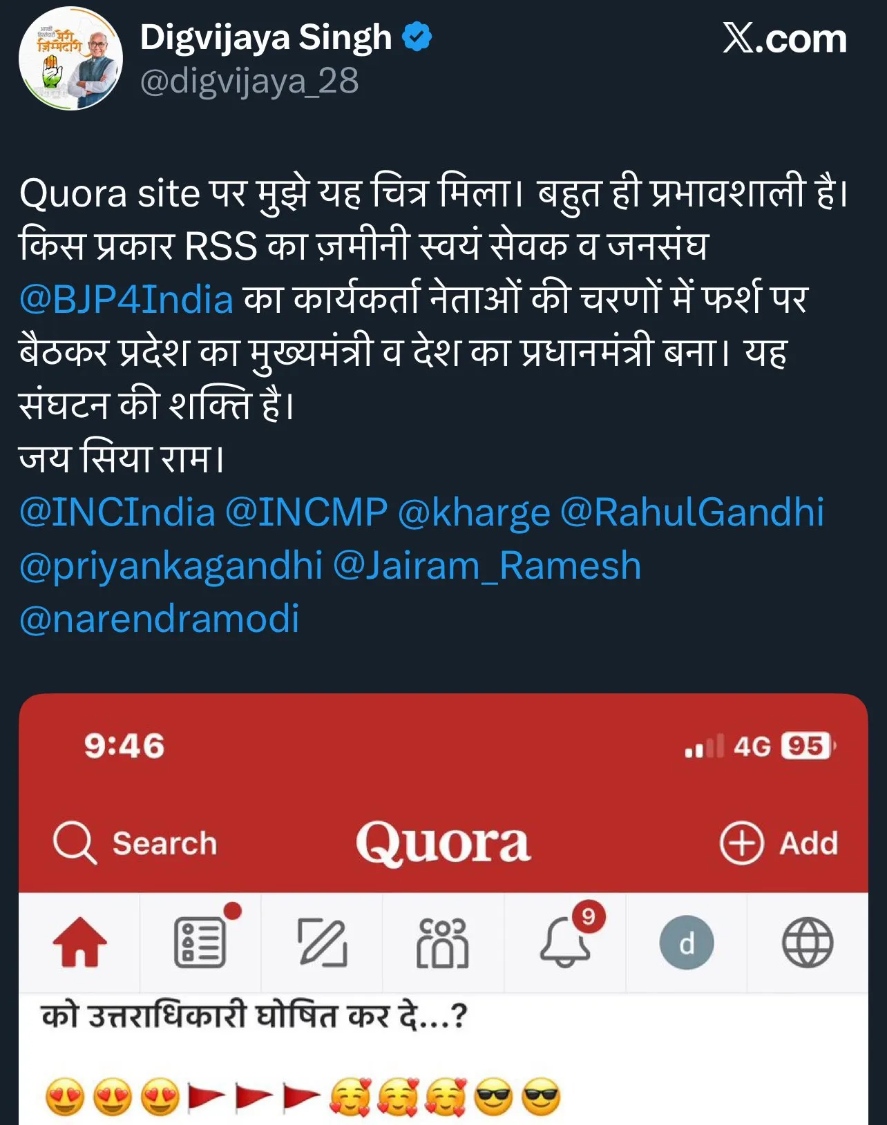 दिग्विजय सिंह ने सोशल मीडिया मंच एक्स पर एक श्वेत-श्याम तस्वीर साझा की, जिसमें युवा नरेन्द्र मोदी भाजपा के वरिष्ठ नेता लालकृष्ण आडवाणी के पास जमीन पर बैठे नजर आ रहे हैं। यह तस्वीर गुजरात में आयोजित किसी पुराने कार्यक्रम की बताई जा रही है। इस तस्वीर के साथ दिग्विजय सिंह ने लिखा कि भाजपा का कार्यकर्ता नीचे बैठकर मुख्यमंत्री बना और फिर प्रधानमंत्री के पद तक पहुंचा। उन्होंने इसे संघ और भाजपा की ‘संगठन शक्ति’ का उदाहरण बताया और अंत में “जय सिया राम” भी लिखा।