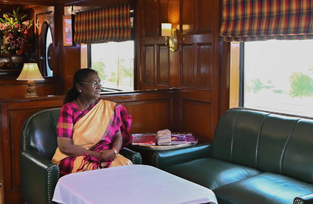 मथुरा। राष्ट्रपति द्रौपदी मुर्मू ने गुरुवार को दुनिया की सबसे लग्जरी ट्रेन मानी जाने वाली महाराजा एक्सप्रेस से वृंदावन पहुंचकर धार्मिक यात्रा की। सुबह 8 बजे दिल्ली से रवाना होकर वह करीब 10 बजे वृंदावन रोड रेलवे स्टेशन पहुँचीं। राष्ट्रपति के इस दौरे को लेकर मथुरा और वृंदावन में सुरक्षा के अभूतपूर्व इंतजाम किए गए थे।