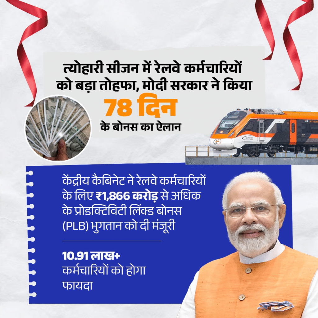 केंद्रीय सूचना एवं प्रसारण मंत्री अश्विनी वैष्णव ने बताया कि सरकार ने 10.90 लाख रेलवे कर्मचारियों को 78 दिन के बोनस के रूप में 1,865.68 करोड़ रुपये देने का फैसला किया है। यह राशि अक्टूबर तक कर्मचारियों के खाते में पहुंच जाएगी। बोनस राशि प्रति कर्मचारी लगभग 17,951 रुपये तय की गई है।