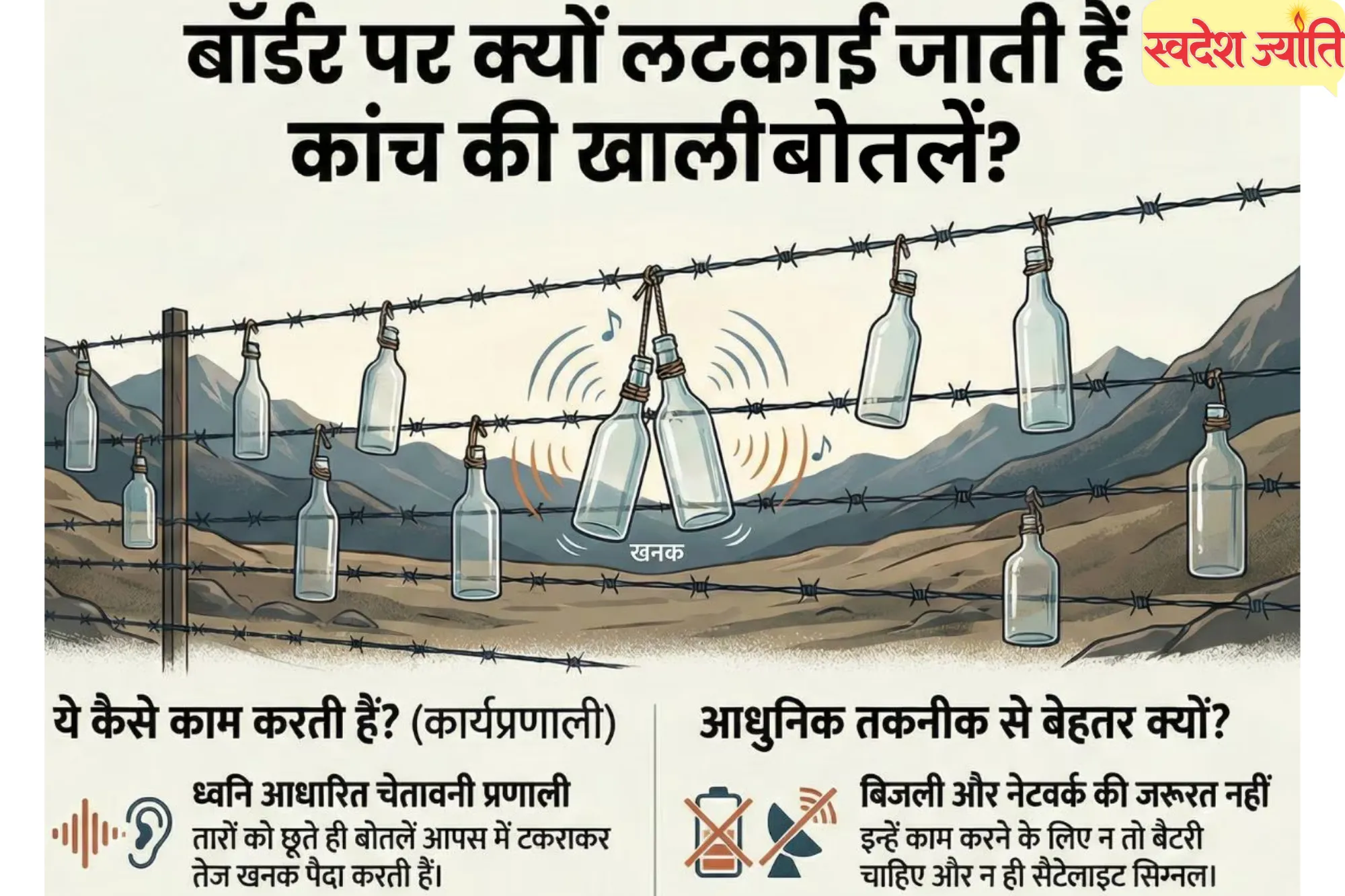 नई दिल्ली। जब भी भारत की सीमाओं के बारे में चर्चा होती है, तो आमतौर पर कांटेदार तारों की बाड़ की छवि उभरती है, जो अक्सर फिल्मों और टेलीविजन पर दिखाई देती है। लेकिन, आपको बाड़ के किनारे थोड़ी-थोड़ी दूरी पर लटकी हुई कांच की बोतलें दिखाई दें तो आप क्या सोचेंगे। ये देखने में साधारण, यहां तक कि फेंकी हुई भी लग सकती हैं, लेकिन ये राष्ट्र की सुरक्षा में एक महत्वपूर्ण भूमिका निभाती हैं। जो हमें कचरा लगता है, वह सीमा रक्षकों के लिए एक