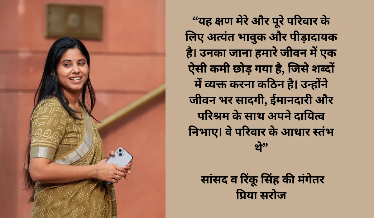 “आज जब पिता का निधन हुआ तो पूरी दुनिया ने कहा कि भारतीय टीम के खिलाड़ी रिंकू सिंह के पिता का निधन हुआ।”दुनिया के किसी भी पिता के लिए इससे ज्यादा गर्व की अनुभूति नहीं हो सकती की दुनिया उसे अपने बच्चों के नाम से पहचानें।