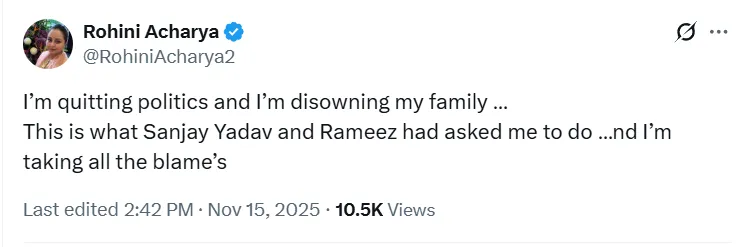 रोहिणी के बयान ने इन सवालों को और अधिक धार दे दी है, जिससे तेजस्वी और उनके नेतृत्व पर उठ रही आलोचना अब सार्वजनिक बहस में बदल गई है।
